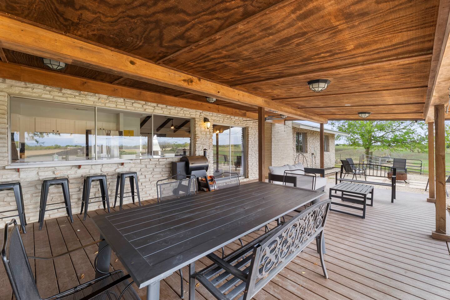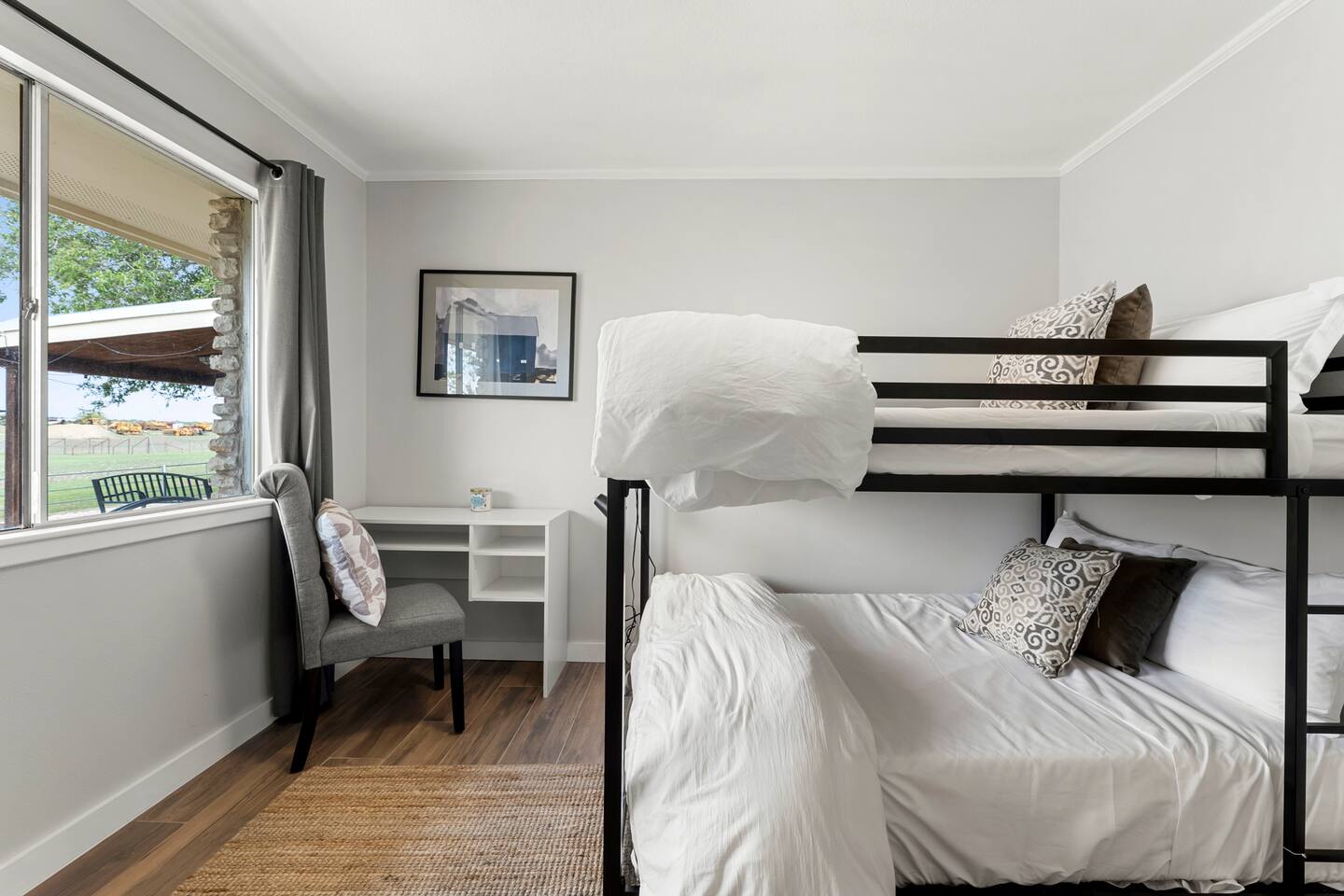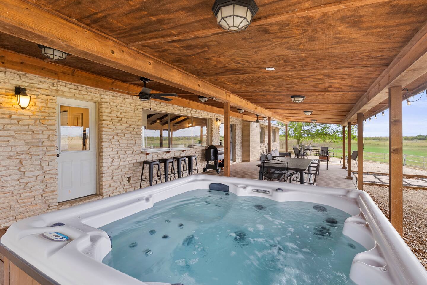 Escape to your private farmhouse retreat on 15 peaceful acres in Texas Hill Country. This spacious, family-friendly home blends rustic charm with modern comfort — complete with Starlink high-speed internet (240 Mbps), a hot tub, a full game room, and plenty of space to relax indoors and out. Farm Animals & Outdoor Fun Meet our friendly goats, alpacas, and mini cows — guest favorites for feeding and photos. Wander the private farm trails, enjoy sunset views, grill dinner on the covered deck, or end the night around the fire pit under the stars. Inside the Farmhouse Step into a warm and welcoming home with vaulted ceilings, comfortable furnishings, and a modern kitchen featuring a GE induction stove. The indoor wood-burning fireplace creates the perfect atmosphere for cozy nights. A dedicated workspace and fast Starlink WiFi make it easy for remote workers or large groups to stay connected. Game Room & Entertainment Your group will love the fully equipped game room with: • Pool table • Shuffleboard • Poker table • TV & hangout space Sleeping Arrangements • Master Suite: King bed + ensuite bathroom • Bedroom 2: Queen bed (sleeps 2) • Bedroom 3: Bunk bed (sleeps 4) • Game Room: Full sofa bed (sleeps 2) Outdoor Living • Large covered deck with hot tub, dining table & BBQ grill • Fire pit (bring your own firewood) • Scenic 15-acre property to explore • Parking for up to 6 cars Location A peaceful country setting just minutes from the best of Central Texas: • 11 mins to San Marcos (restaurants, shopping, outlets) • 18 mins to Gruene Hall & Guadalupe River tubing • 20 mins to Schlitterbahn Waterpark Multiple Dwellings on the Property The 15-acre farm includes both the farmhouse and a separate geodesic dome. These can be booked together or separately. You may see other guests on the property, but your home and outdoor areas are completely private. Please remember you’re staying on a working farm. You may see our friendly carpenter working in the barn during the day, and our caretaker visits daily to feed and check on the animals. They respect your privacy and are available if you need anything. Your farmhouse and outdoor areas are fully private. We care about transparency: This is a functioning farm with animals and daily activity Exterior security cameras monitor driveway and barn areas only The fire pit requires BYO firewood The farm store at the top of the property opens occasionally for events Ongoing Improvements We continue to make enhancements around the property (like our stocked fishing/swimming pond). All work is kept away from guest areas and does not affect your stay. Your Farm Stay Awaits Relax, reconnect with nature, and make lasting memories at this unique Texas Hill Country getaway.