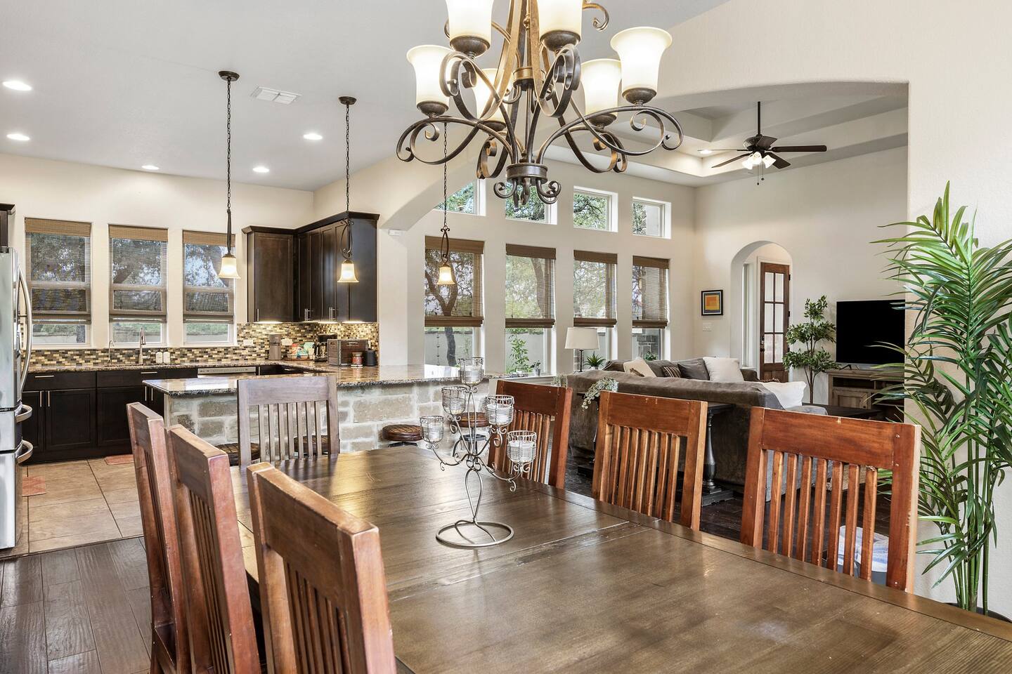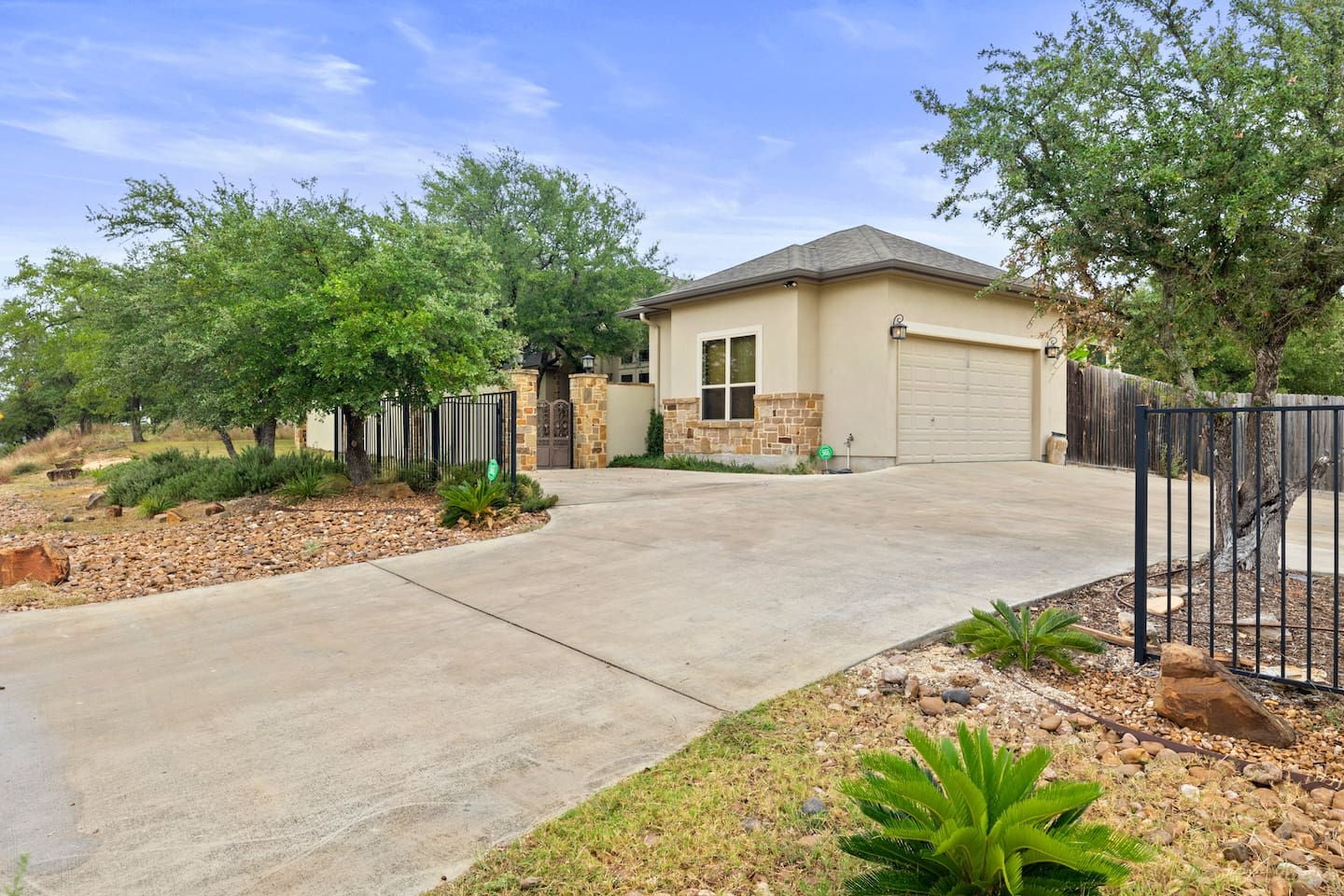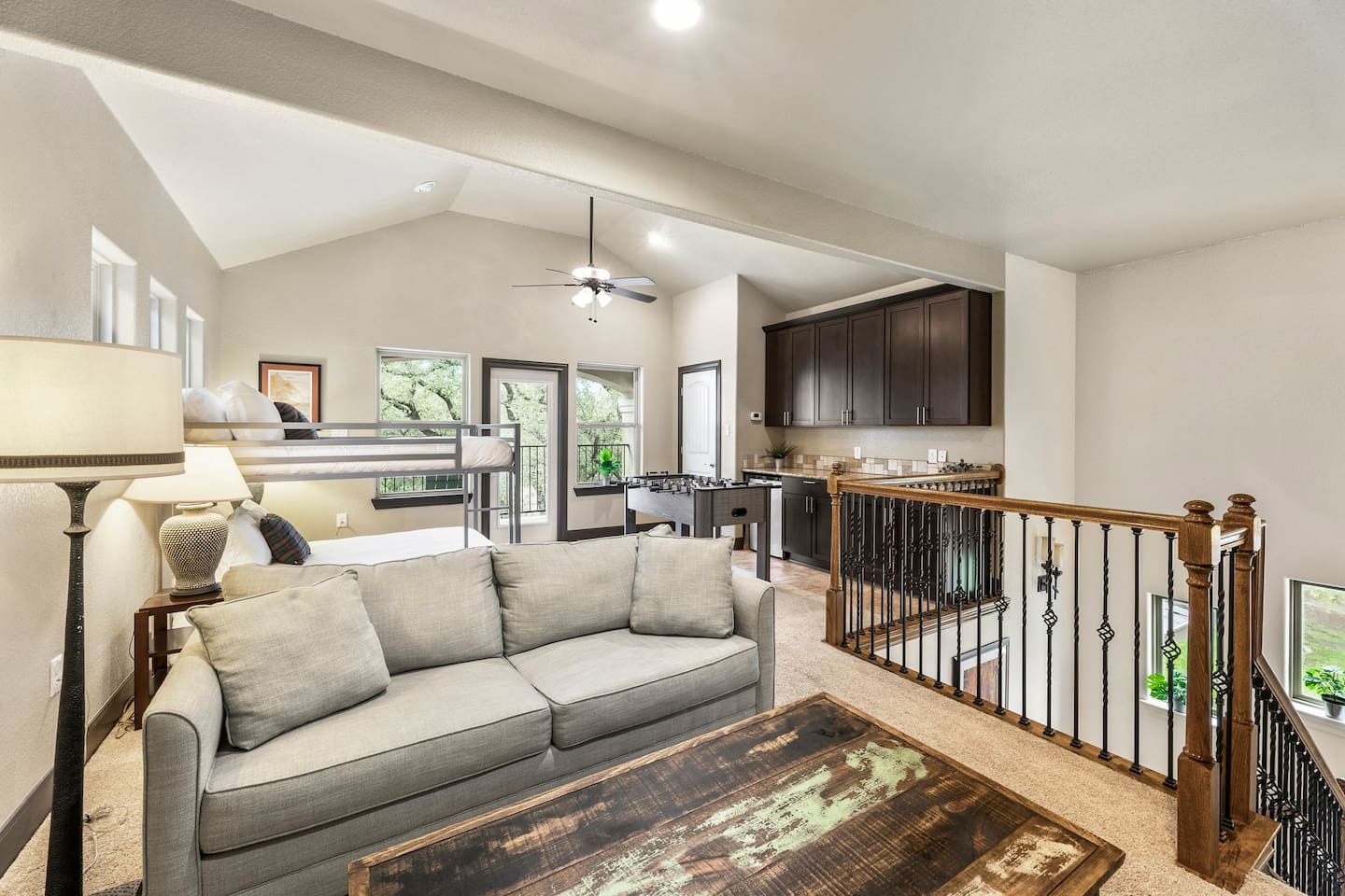 Escape to our luxurious 3-bedroom Hill Country Getaway, perfect for families, groups, and friends looking for a relaxing retreat near Canyon Lake. Bring the whole family—and even your furry friends—for an unforgettable stay just steps from the water. The Space This stylish home is designed for making memories. Gather in the spacious living room and get cozy by the wood-burning stone fireplace, or prepare delicious meals in the fully equipped kitchen, complete with a large granite island and modern appliances. The fun never stops with multiple game areas! Challenge friends in the garage game room with a round of pool, or head to the upstairs loft for foosball, retro arcade games, a sofa bed, and a collection of board games. For those needing to stay connected, a dedicated workspace is available in the office. Your private outdoor oasis includes a beautiful lagoon-style natural pond beside the home (this is not a swimming pool) and a bubbling hot tub with a peaceful garden view. In the evening, fire up the BBQ grill for an alfresco dinner, then gather around the firepit under the stars. Sleeping Arrangements Master Bedroom: Two Queen Beds (sleeps 4) Bedroom #2: King Bed (sleeps 2) Bedroom #3: Full Bunk Bed (sleeps 4) Upstairs Loft: Pull-out Sofa Bed (sleeps 2) Upstairs Loft: Full Bunk Bed (sleeps 4) Office: Twin Single Bed (sleeps 1) Guest Access You will have exclusive and private access to the entire house, yard, hot tub, pond area, and all amenities. Please make yourself at home. The Neighborhood Our home is perfectly situated to enjoy the best of the Hill Country. You're just steps from a Canyon Lake boat ramp, making it easy to get out on the water. Enjoy the quiet surroundings and glimpses of lake views through the trees. Getting Around A private driveway is available for your vehicles. Please be aware that street parking is not permitted in the neighborhood. House Rules Pets are allowed. We have a strict no events or parties policy. Please be respectful of the property and our neighbors. Important Information For your security, the property has exterior-only cameras monitoring the driveway and entrances. No cameras are located inside the home. We also provide family-friendly touches including a pack ’n play and a high chair. Please remember that you're staying in a private home, not a hotel. While there is no one living on-site 24/7, we are always available to assist you if any problems arise.