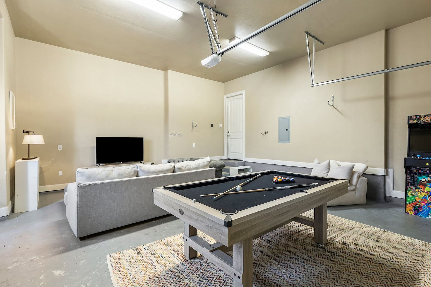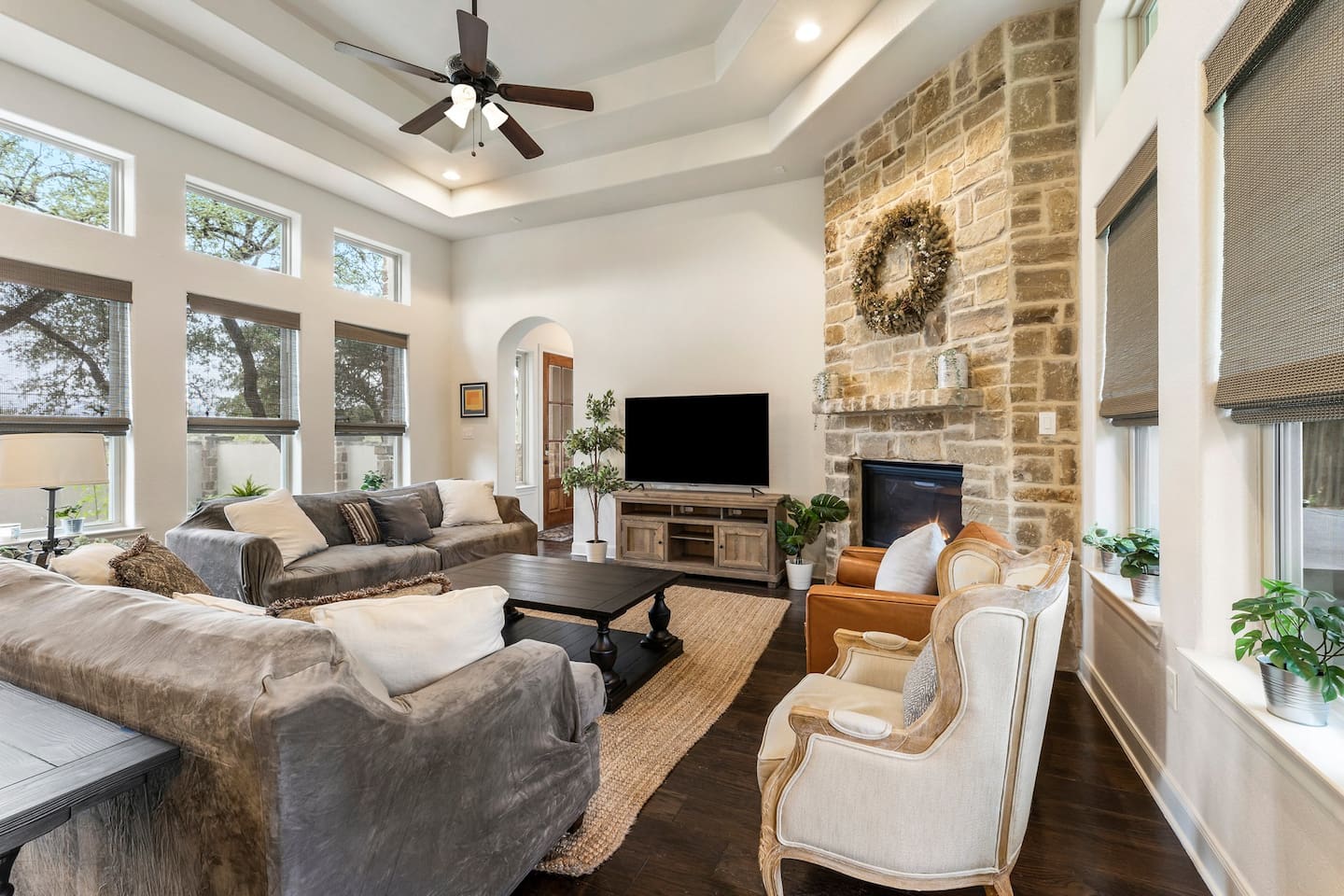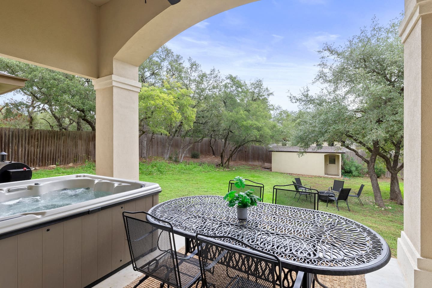 Escape to our luxurious 3-bedroom Hill Country Getaway, perfect for families, groups, and friends looking for a relaxing retreat near Canyon Lake. Bring the whole family—and even your furry friends—for an unforgettable stay just steps from the water. The Space This stylish home is designed for making memories. Gather in the spacious living room and get cozy by the wood-burning stone fireplace, or prepare delicious meals in the fully equipped kitchen, complete with a large granite island and modern appliances. The fun never stops with multiple game areas! Challenge friends in the garage game room with a round of pool, or head to the upstairs loft for foosball, retro arcade games, a sofa bed, and a collection of board games. For those needing to stay connected, a dedicated workspace is available in the office. Your private outdoor oasis includes a beautiful lagoon-style natural pond beside the home (this is not a swimming pool) and a bubbling hot tub with a peaceful garden view. In the evening, fire up the BBQ grill for an alfresco dinner, then gather around the firepit under the stars. Sleeping Arrangements Master Bedroom: Two Queen Beds (sleeps 4) Bedroom #2: King Bed (sleeps 2) Bedroom #3: Full Bunk Bed (sleeps 4) Upstairs Loft: Pull-out Sofa Bed (sleeps 2) Upstairs Loft: Full Bunk Bed (sleeps 4) Office: Twin Single Bed (sleeps 1) Guest Access You will have exclusive and private access to the entire house, yard, hot tub, pond area, and all amenities. Please make yourself at home. The Neighborhood Our home is perfectly situated to enjoy the best of the Hill Country. You're just steps from a Canyon Lake boat ramp, making it easy to get out on the water. Enjoy the quiet surroundings and glimpses of lake views through the trees. Getting Around A private driveway is available for your vehicles. Please be aware that street parking is not permitted in the neighborhood. House Rules Pets are allowed. We have a strict no events or parties policy. Please be respectful of the property and our neighbors. Important Information For your security, the property has exterior-only cameras monitoring the driveway and entrances. No cameras are located inside the home. We also provide family-friendly touches including a pack ’n play and a high chair. Please remember that you're staying in a private home, not a hotel. While there is no one living on-site 24/7, we are always available to assist you if any problems arise.